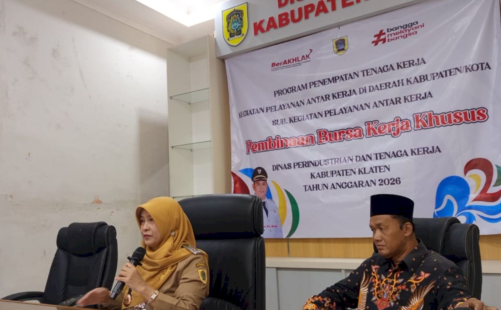 Klaten — Dinas Perindustrian dan Tenaga Kerja (Disperinaker) Kabupaten Klaten menyelenggarakan kegiatan Pembinaan Bursa Kerja Khusus (BKK) SMK se-Kabupaten Klaten sebagai upaya optimalisasi penempatan tenaga kerja, khususnya bagi lulusan Sekolah Menengah Kejuruan (SMK), pada tahun 2026.